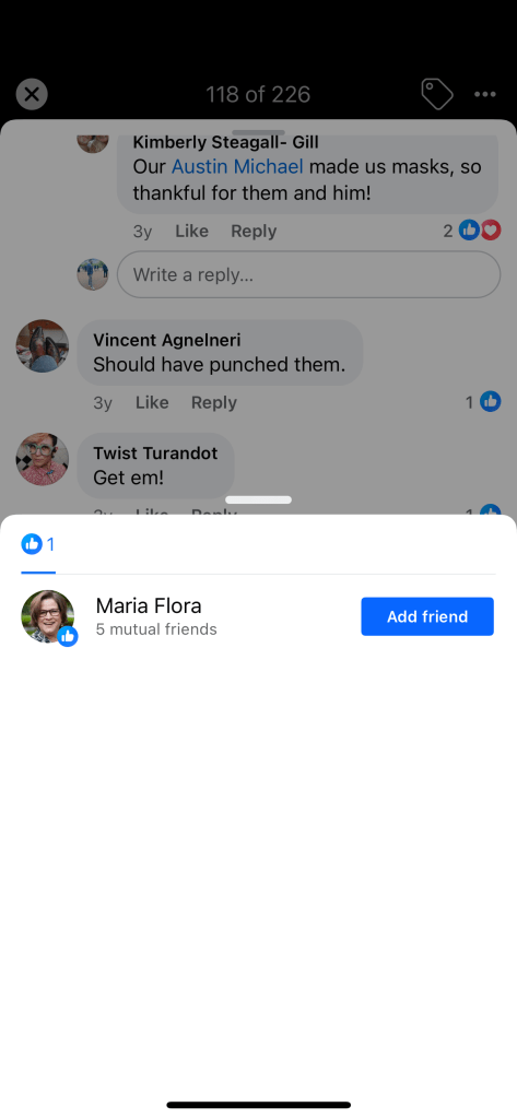 Several people commented on Flora’s post. She “liked” many of the comments which were calling for increasing violent behavior.