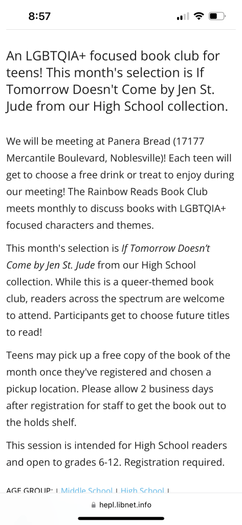The porn and snacks children’s club was part of HEPL’s “Rainbow Reads” initiative. According to the HEPL website, Rainbow Reads is “an LGBTQIA+ focused book club for teens! This month’s selection is If Tomorrow Doesn’t Come… teens may pick up a free copy of the book of the month once they’ve registered… This session is intended for High School readers and is open to grades 6-12.”
