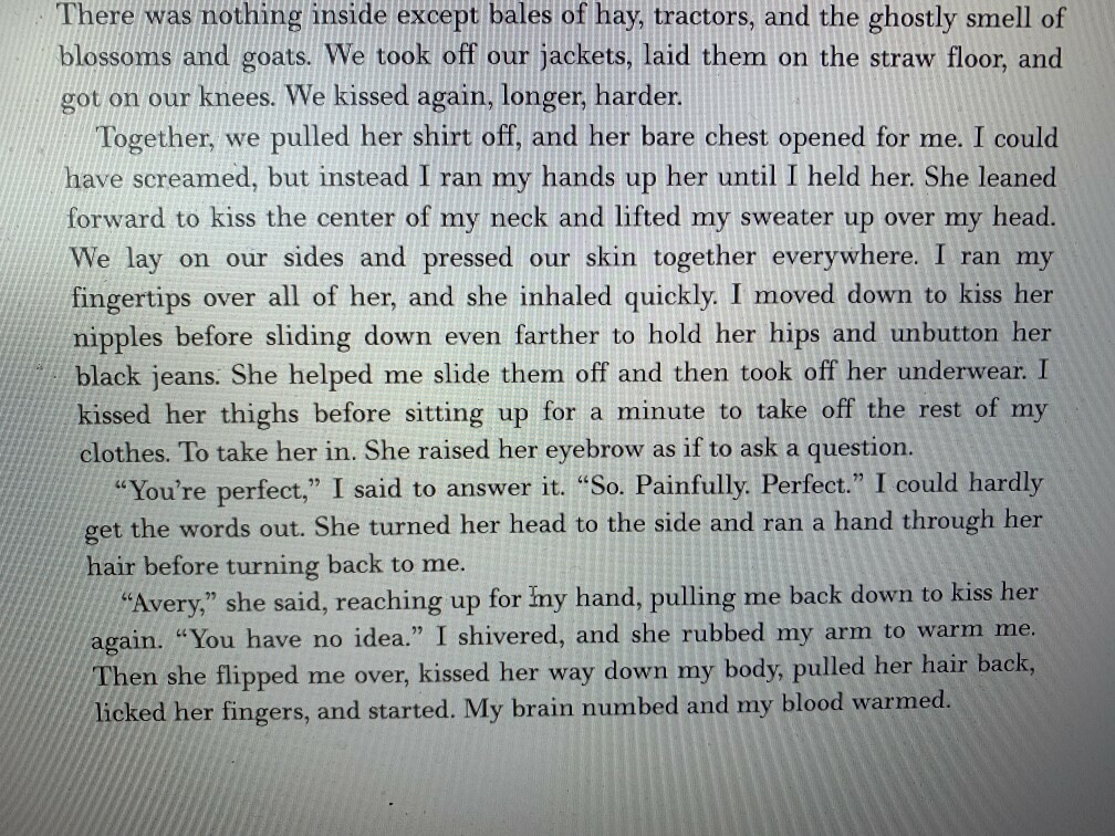 “That’s right,’ she said when my tongue found the right pacing. ‘Don’t stop,’ she said when I found the right place to pull. ‘God, Avery,’ she said again when I put my fingers inside her and pressed.’”