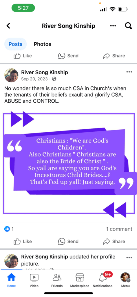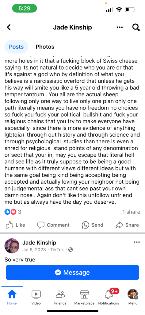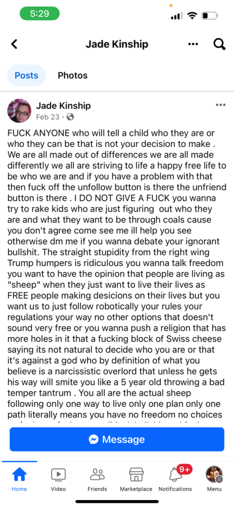 According to sources, the parents of the “transgender” child have taken to social media to attack Christians and conservatives for their beliefs. RNCI has learned through sources at the school the mother goes by the name “River Song Kinship” on social media. Her husband goes by the name “Jade Kinship”. Below are just a few of their threatening and derogatory social media posts.