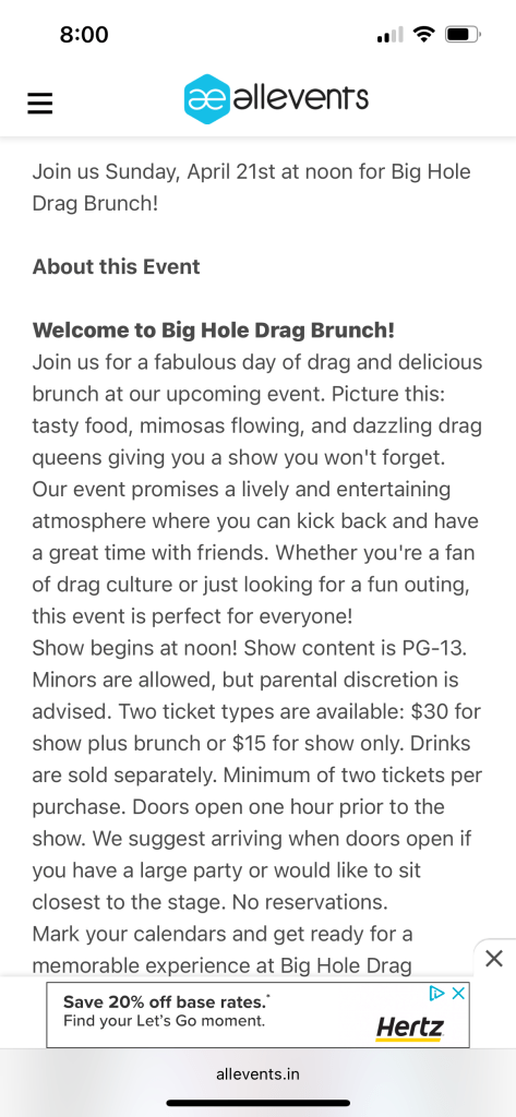 “Picture this: tasty food, mimosas flowing, and dazzling drag queens giving you a show you won’t forget.” A description of the event on the ticket sales website, eventbrite, states. “Minors are allowed, but parental discretion is advised.”