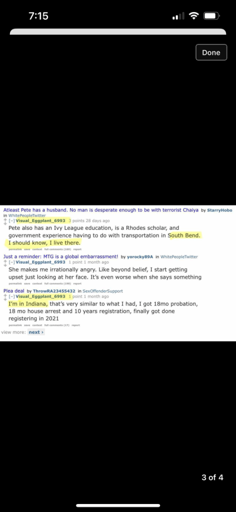 In other posts, the user explains that he lives in South Bend and was taken off of the sex offender registry in 2021.