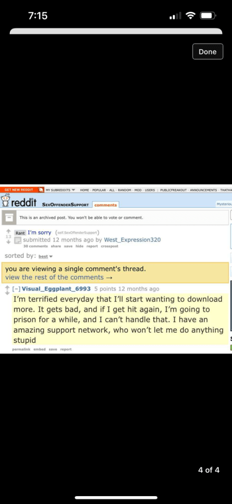 “I’m terrified everyday that I’ll start wanting to download more. It gets bad, and if I get hit again, I’m going to prison for a while, and I can’t handle that. I have an amazing support network, who won’t let me do anything stupid.” Visual_Eggplant_6993 wrote in a sex offender support group thread 12 months ago.