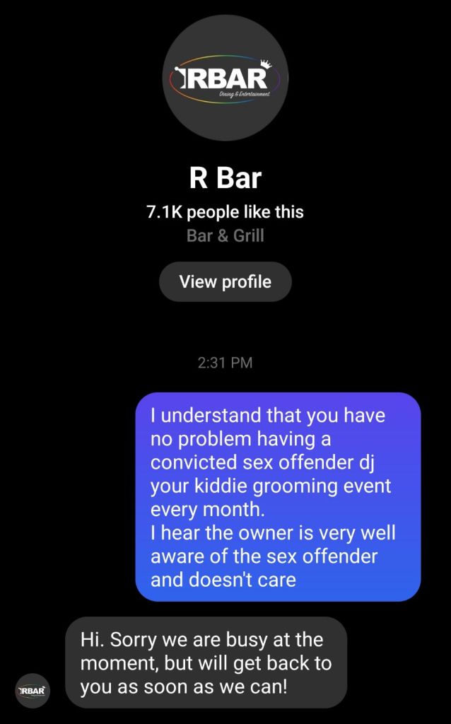 REAL News Michiana reached out to R Bar for comment and more information about the thread, and never received a response. However, another concerned citizen also reached out to R Bar on Facebook, in which the bar confirmed it had a sex offender working as a DJ in the establishment.