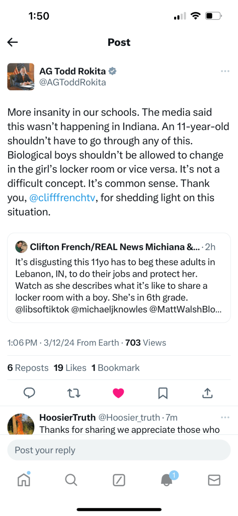 “More insanity in our schools. The media said this wasn’t happening in Indiana.” Rokita wrote in posts to Facebook and X (formerly known as Twitter), sharing the REAL News story. “An 11-year-old shouldn’t have to go through any of this. Biological boys shouldn’t be allowed to change in the girls’ locker room or vice versa. It’s not a difficult concept. It’s common sense. Thank you (REAL News Reporter) Clifton French… for shedding light on this situation.”