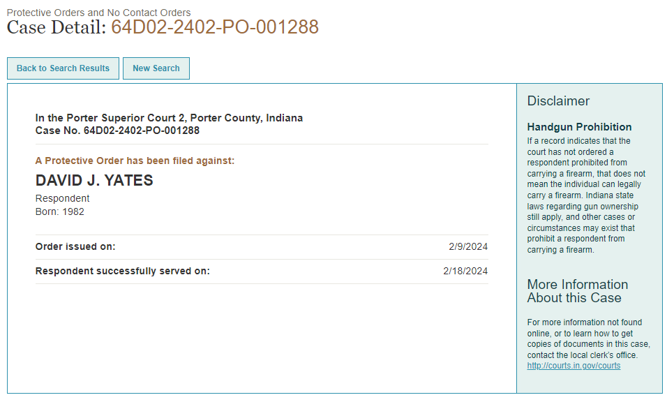In February, the victim petitioned the court for an Order of Protection against Yates. A judge awarded the PO to the alleged victim on February 9th. Yates did not dispute the order or the victim’s testimony in court. The PO is still active.